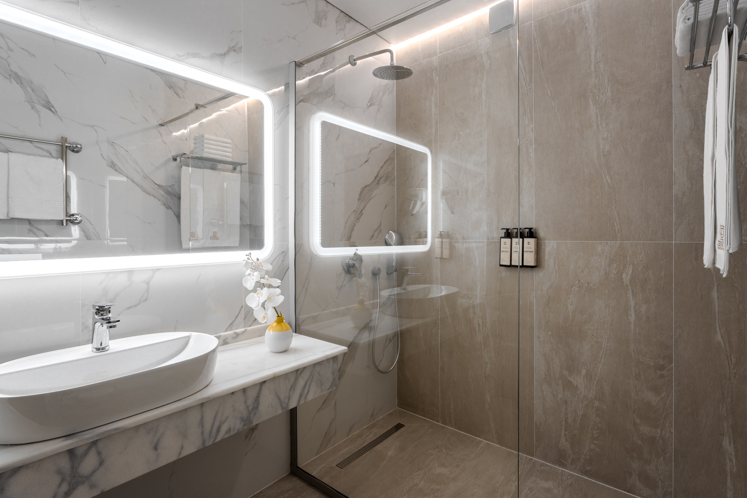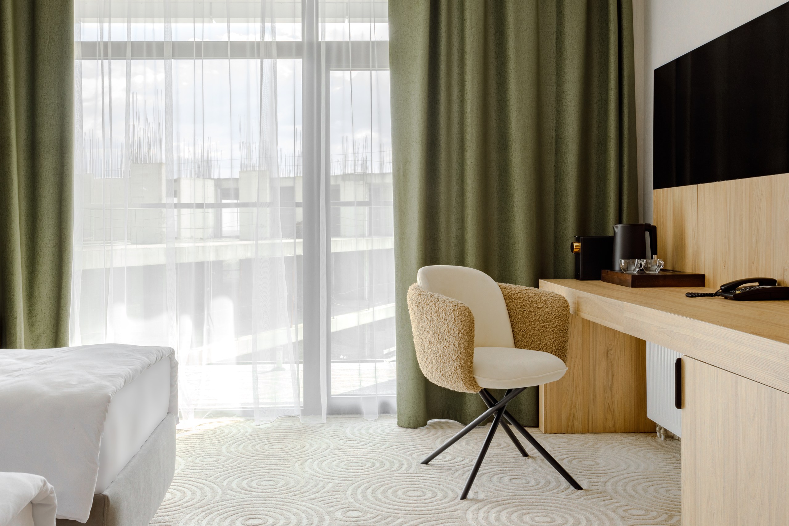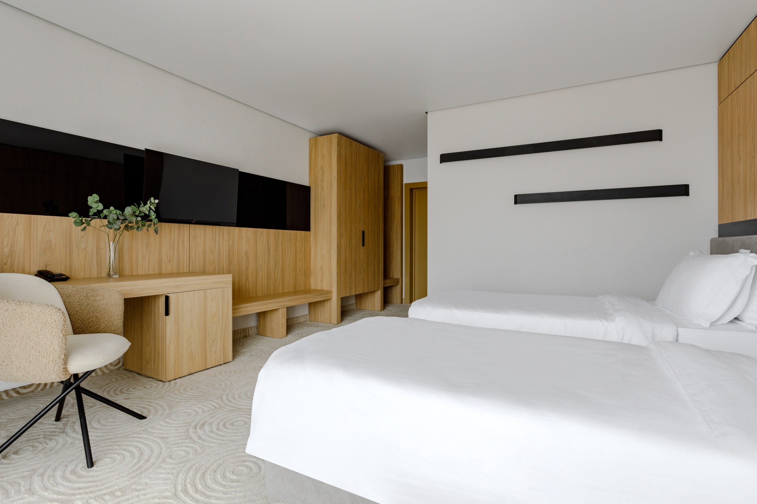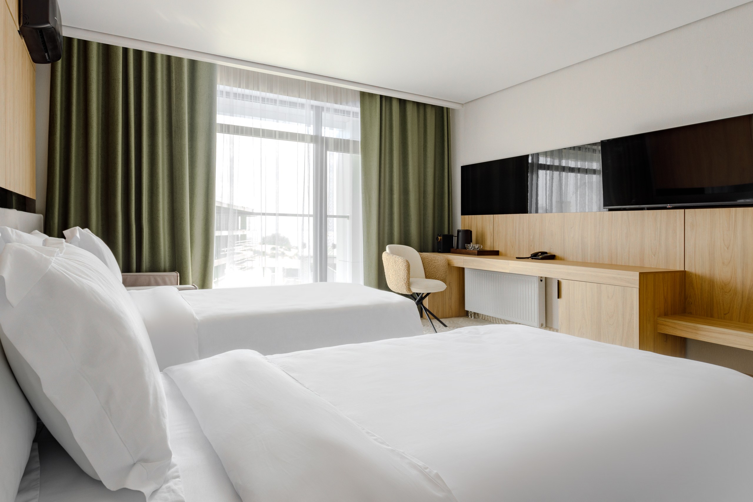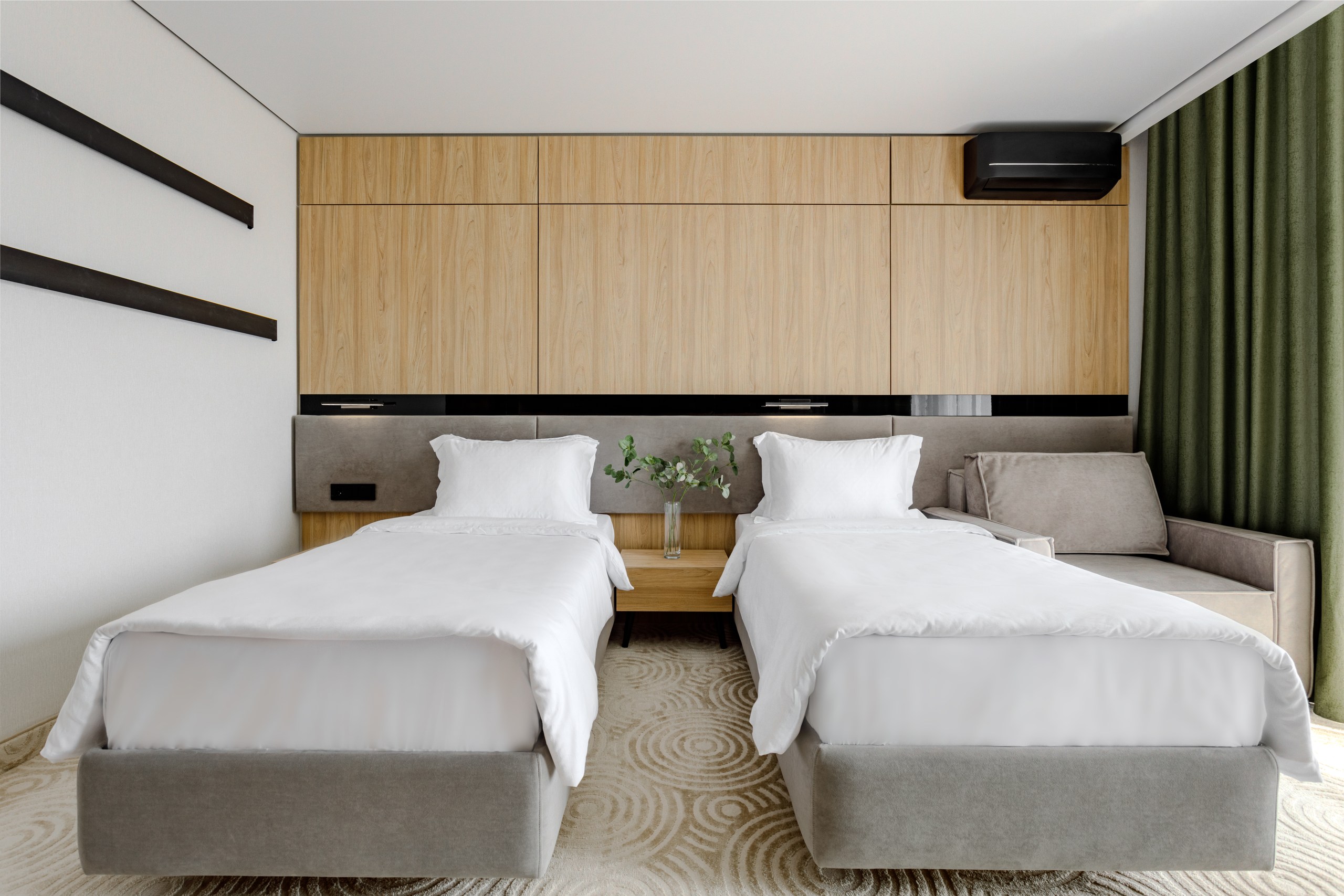 Комфортные однокомнатные номера с двумя односпальными кроватями, с панорамными окнами и зонами для отдыха и работы. Номера расположены на 4 этаже. Для размещения двоих гостей на основных местах и одного ребенка до 14 лет включительно – на дополнительном месте (кресло-кровать). Дети принимаются с любого возраста. Один ребёнок в номере до 3 лет включительно без места, но с питанием может проживать бесплатно (при занятых основных местах в номере). Детская кроватка предоставляется бесплатно, при наличии свободной.
